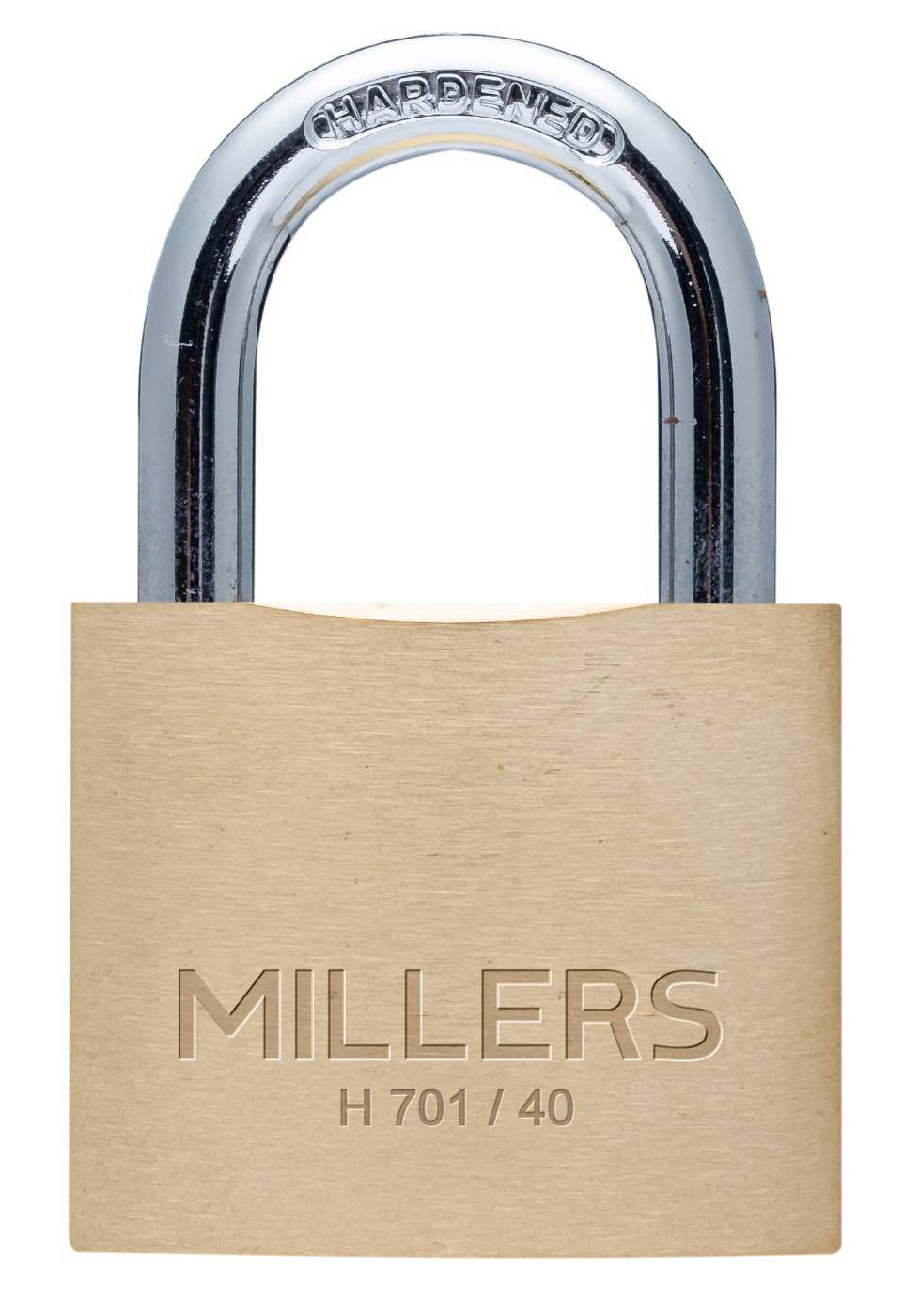 Hengelås av kraftigere modell, i massiv messing med sylinder i messing. Herdet dobbelreilet bøyle i stål.