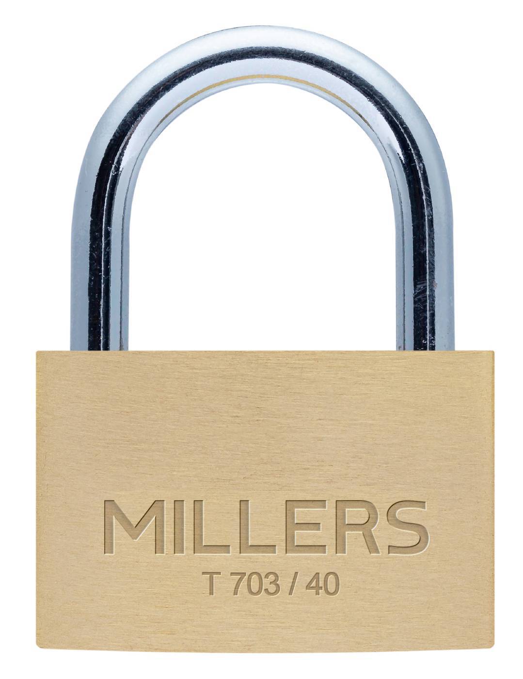 Hengelås i massiv messing med sylinder i messing. Herdet enkelreilet bøyle i stål.