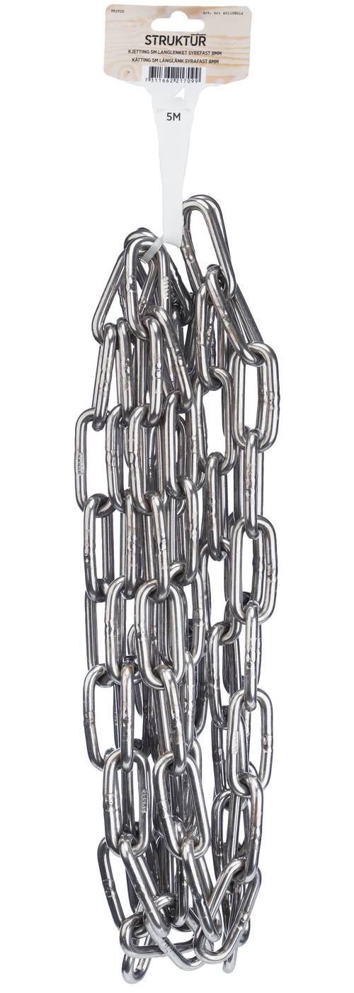 Brukes i de mest utsatte miljøene. Kraftig korrosjonsbestandighet. Motstandsdyktig mot rust og syrer. Blank, glinsende overflate. DIN 763/DIN 5685C. AISI 316L (f.o.m. 6mm), Sertifisert i henhold til EN-10204 3.1 (kjemiske og mekaniske egenskaper). Ikke beregnet for løft.