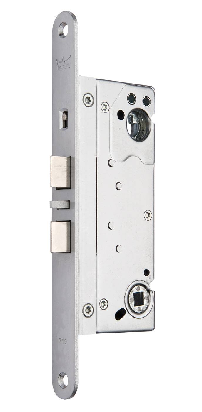 Dobbelfallelås med symmetrisk, mattforkrommet stolpe. Fallestempler av herdet stål. Oppstillingsbar sylinderfalle med knapp eller nøkkel. Vendbar høyre/venstre. Dordybde: 50 mm. Mål stolpe: 22 mm x 225 mm.