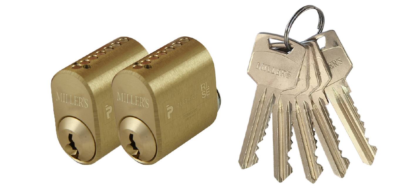 Oval låscylinder i mässing i satser om 2st cylindrar med lika låsning. Levereras med 5st nycklar. 7-stift. För genomgående fastsättning. Uppfyller kraven för klass 3.
