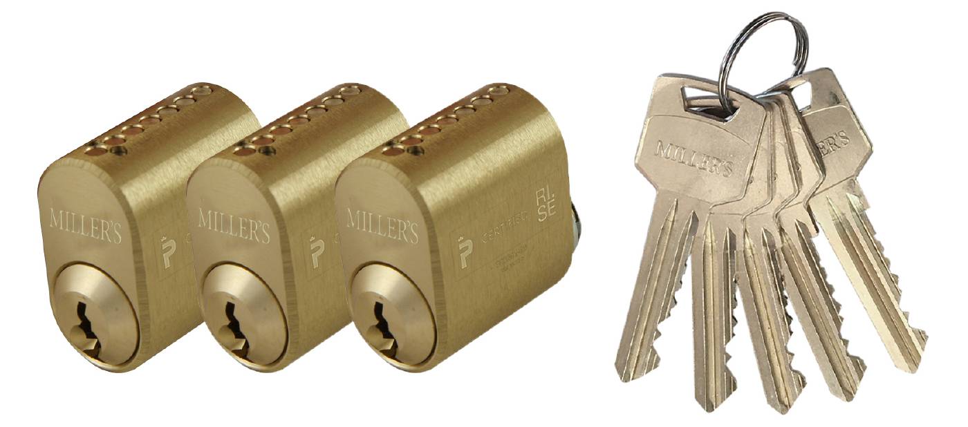 Oval låscylinder i mässing i satser om 3st cylindrar med lika låsning. Levereras med 5st nycklar. 7-stift. För genomgående fastsättning. Uppfyller kraven för klass 3.
