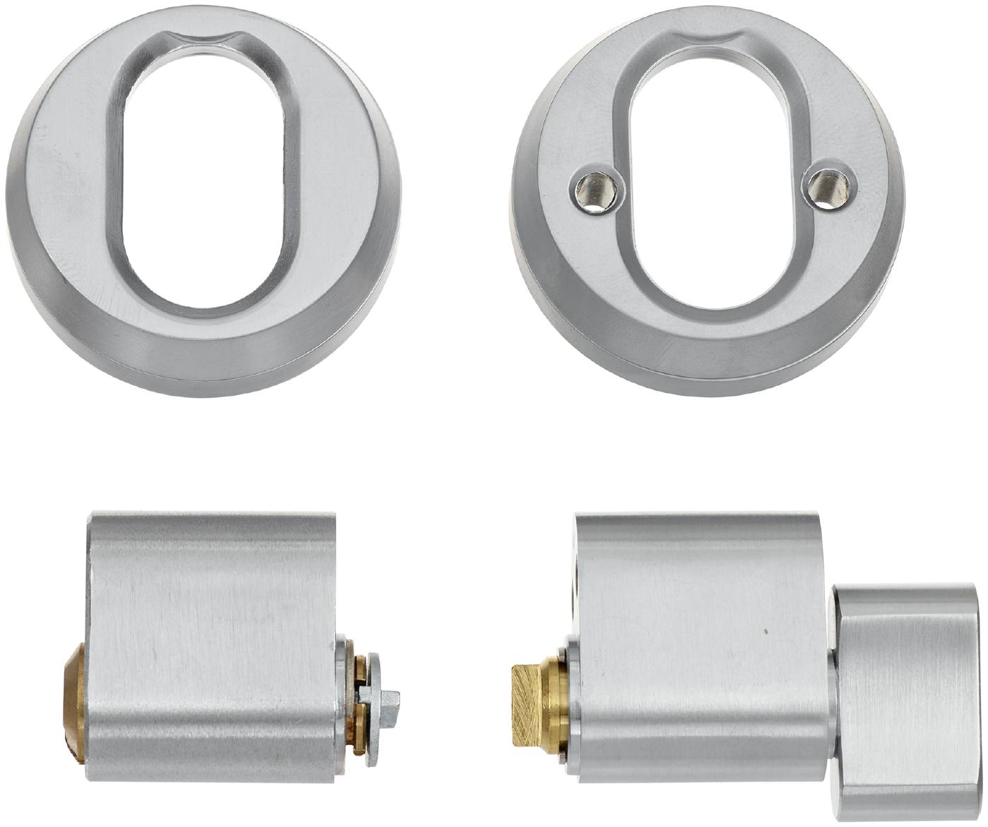 Cylinderset med ovalcylinder utsida och vredcylinder insida och båda med bakkantsfäste där fastsättning av cylindern sker genom låsstolpen. Levereras med cylindrar, universal cylinderringar, skruv och förlängningsdel 15mm. Används där inte speciella säkerhetskrav ställs.