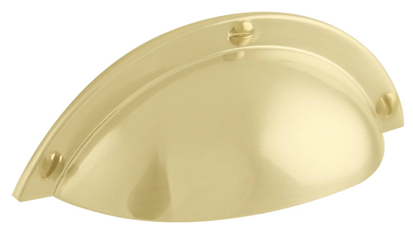 Skålformat handtag med präglade skruvar på handtagets utsida. Handtaget monteras genom skruvar på handtagets baksida.