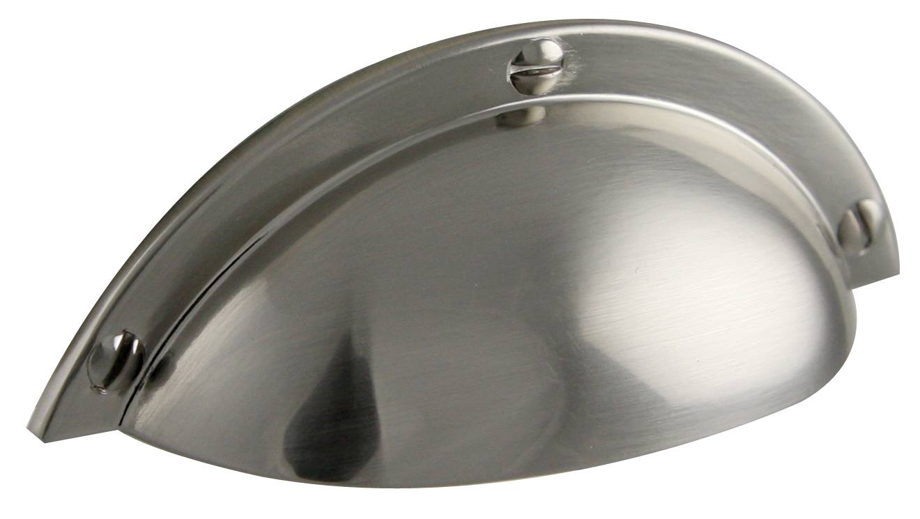 Skålformat handtag med präglade skruvar på handtagets utsida. Handtaget monteras genom skruvar på handtagets baksida.