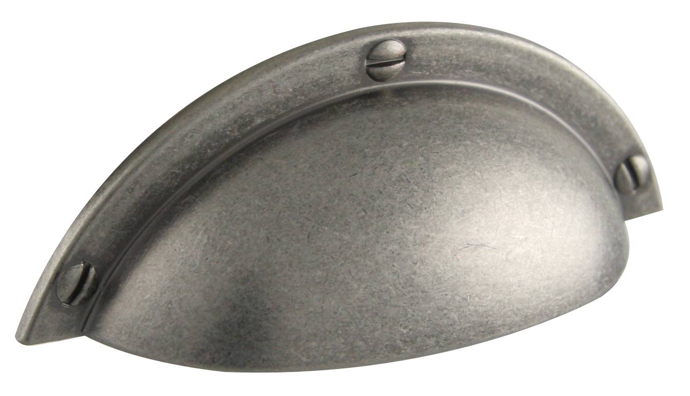 Skålformat handtag med präglade skruvar på handtagets utsida. Handtaget monteras genom skruvar på handtagets baksida.