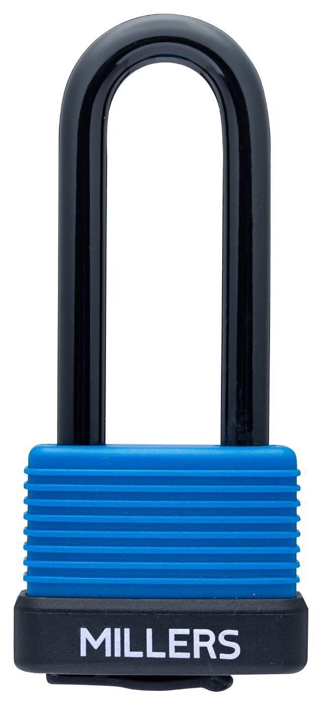 Låshus av aluminium med bygel av stål. Cylinder i mässing. Försedd med ett vädertåligt plastöverdrag som gör att detta lås lämpar sig väl för utomhusbruk. Användningsområde: Båtar, förråd, bodar m.m.