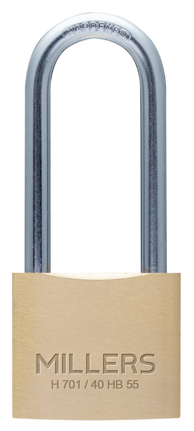 Hänglås av kraftigare modell i massiv mässing med cylinder i mässing. Härdad dubbelreglad bygel i stål.